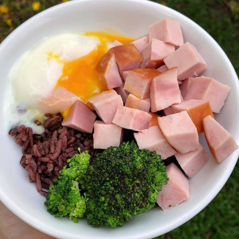 ข้าวกับสเต็กแฮมจากเซเว่น ตัวที่ก้อนละ 90 แคล ทิปด้วยไข่ออนเซ็นจากเซเว่นอีกแหละ