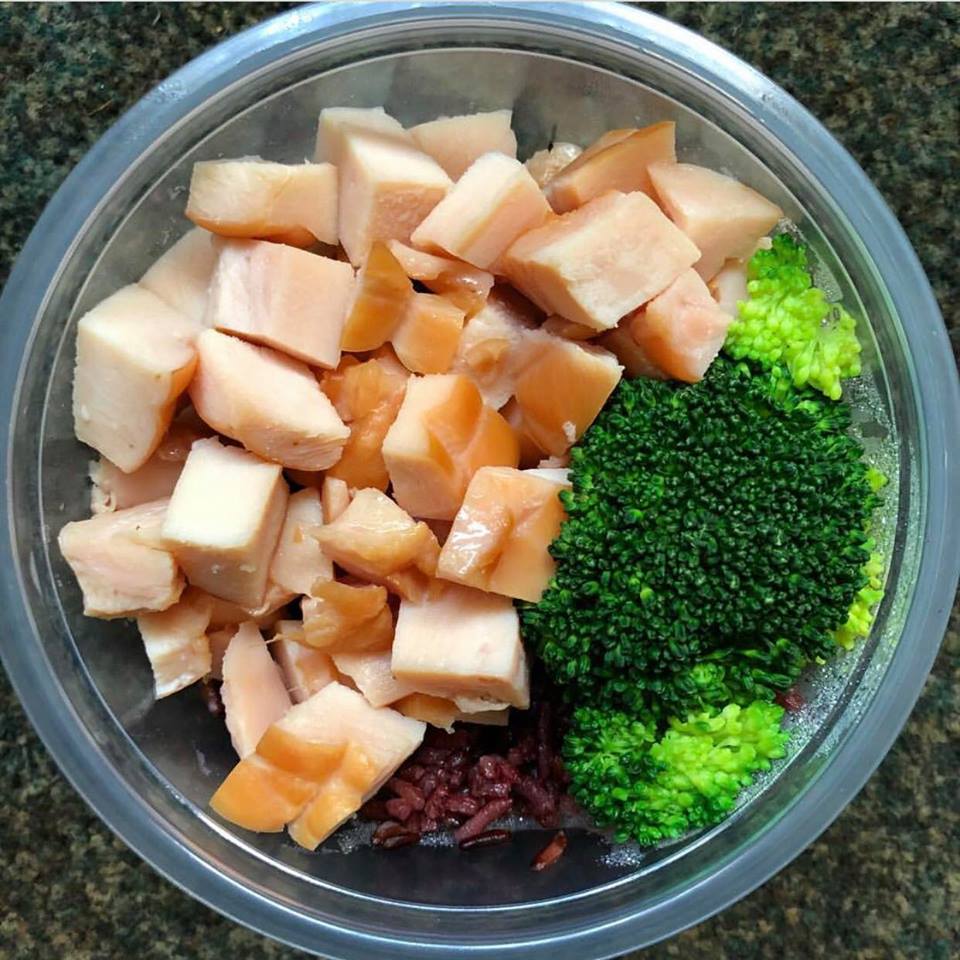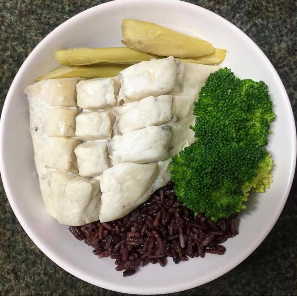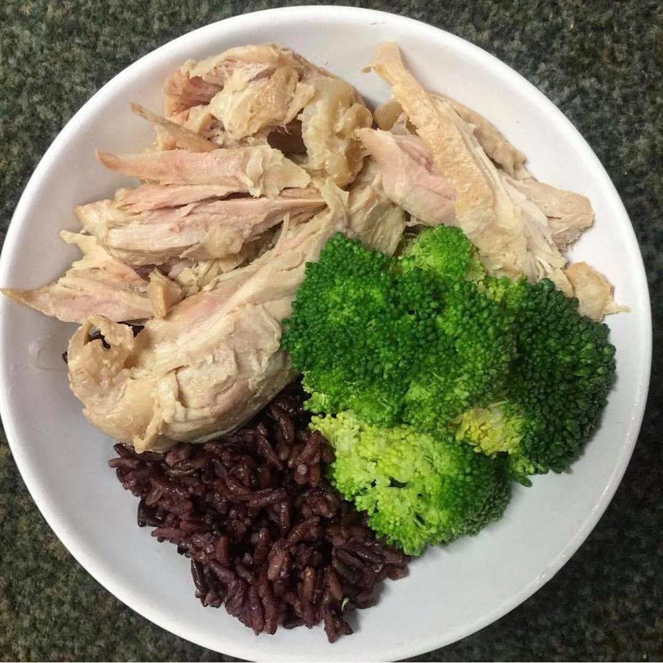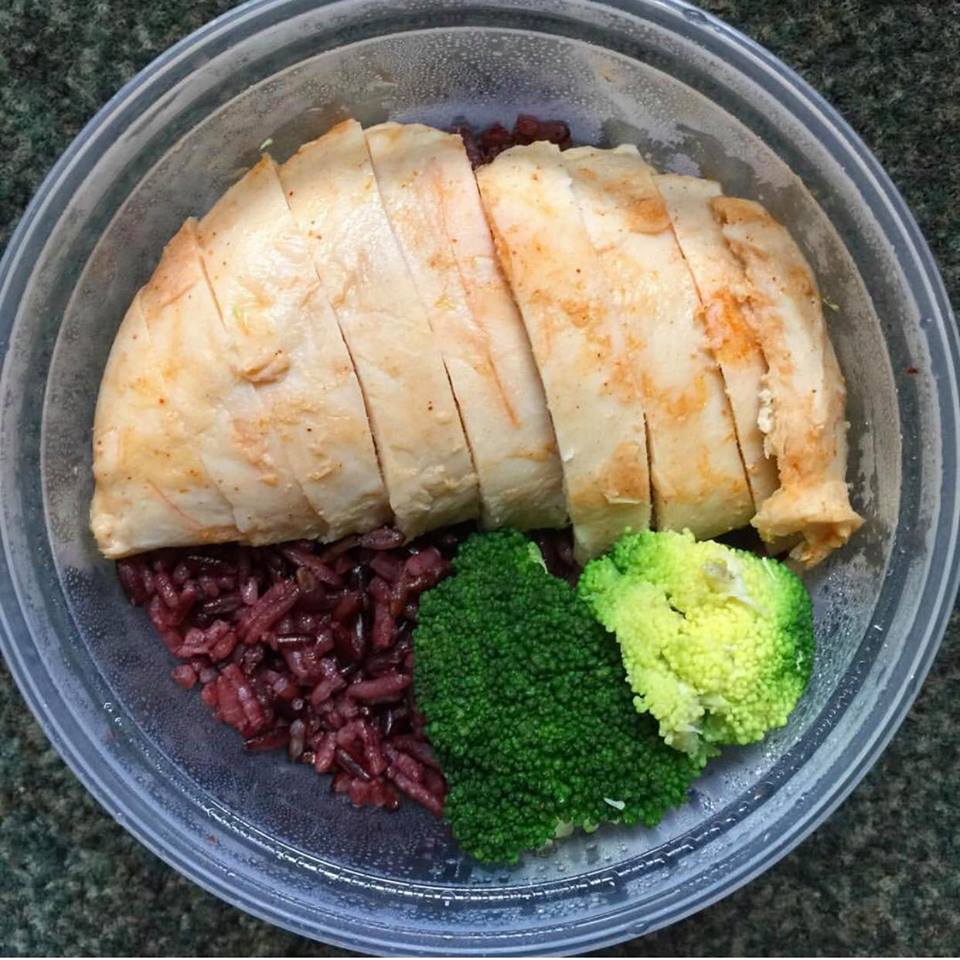 ข้าวกับอกไก่อบชานอ้อย ซื้อจากซุปเปอร์มาร์เกตหรือซุ้มไก่ย่างห้าดาวแถวบ้าน เอาแบบเป็นแพคยังไม่ได้ย่างนะฮะ ตอนจะกินหั่นละเข้าเวฟ 1 นาที กินได้เลย ถ้าเคร่งมากก็ลอกหนังออกก่อน