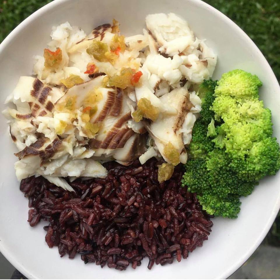 ข้าวกับปลากระพงย่าง กินกับน้ำจิ้มซีฟู้ด