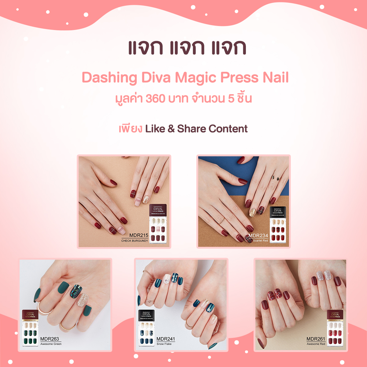 แจก แจก แจก พิเศษสำหรับแฟนๆ ที่อ่านรีวิวนี้ เราจะแจก Dashing Diva Magic Press Nail มูลค่า 360 บาท จำนวน 5 รางวัล มาดูกติกาด้านล่างกันค่ะ ❤ 。◕‿◕